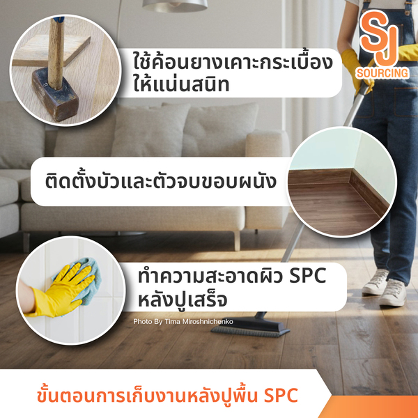 งานปูพื้น SPC จะสมบูรณ์ได้ ต้องมีการเก็บรายละเอียดขั้นสุดท้าย เพื่อความเรียบร้อยดูดีและคงทนแข็งแรงของพื้นหลังปูเสร็จ ตามนี้