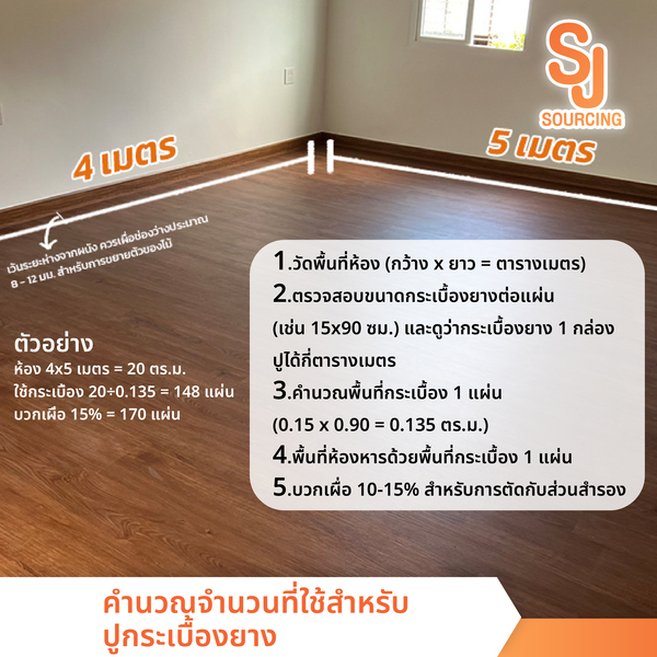 เริ่มด้วยการวัดขนาด ความกว้าง ความยาว ของพื้นที่ห้องที่ต้องการปูพื้น SPC อย่างละเอียด แนะนำให้วัดค่าซ้ำ 2-3 ครั้งเพื่อความแม่นยำ จากนั้นนำมาคำนวณหาพื้นที่โดยรวม แล้วบวกเพิ่มอีก 5-10% เผื่อสำรองใช้ในกรณีผิดพลาดหรือตัดเข้ามุม จะได้จำนวนแผ่นที่ต้องใช้ทั้งหมด