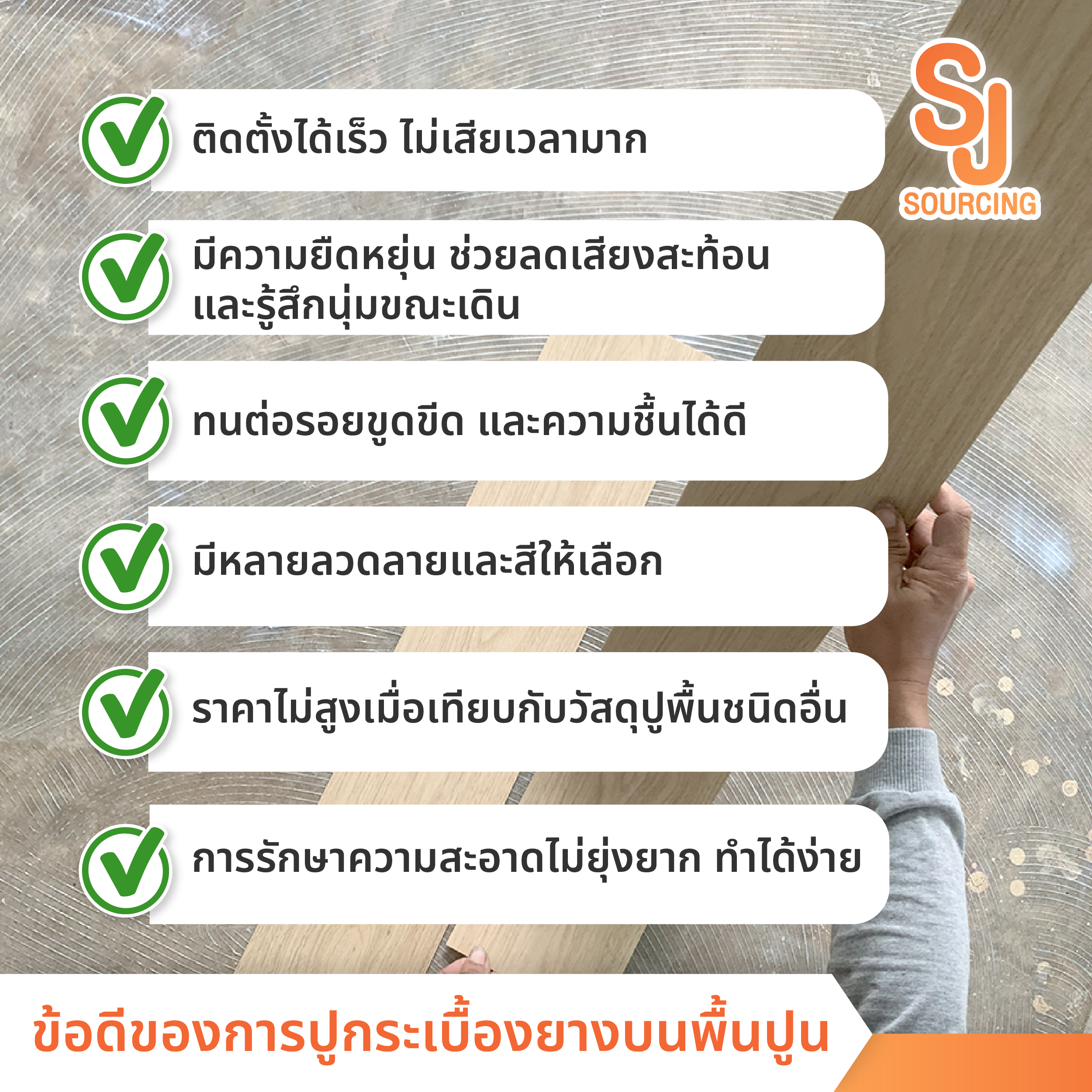 ไม่ว่าจะปูแบบใช้กาวหรือแบบลอคตัว วิธีปูกระเบื้องยางบนพื้นปูนก็เป็นงานที่สามารถลงมือทำเองได้ ถ้ามีการเตรียมตัวและเรียนรู้วิธีการที่ถูกต้อง แต่สำหรับพื้นที่ขนาดใหญ่หรือต้องการความละเอียดประณีตเป็นพิเศษ อาจพิจารณาใช้บริการจากผู้เชี่ยวชาญอย่างเรา S.J.Sourcing เพื่อให้งานออกมาสมบูรณ์ค่ะ