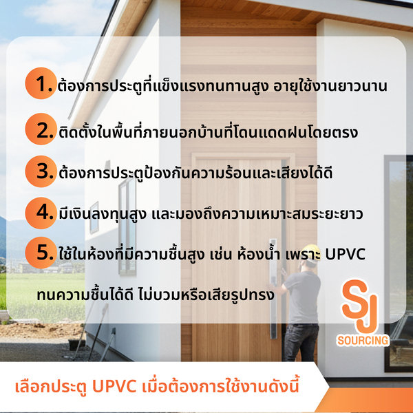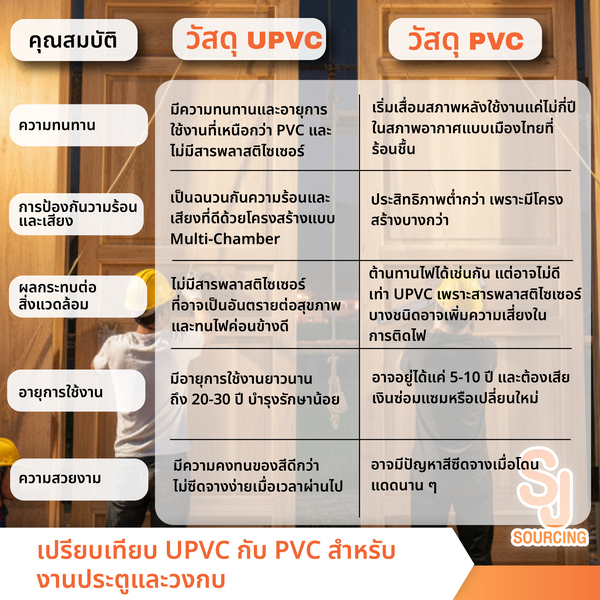 การเลือกวัสดุประตูบ้าน ส่งผลต่อความสวย ความปลอดภัย และอายุการใช้งานของบ้านค่ะ วัสดุพลาสติกอย่าง UPVC กับ PVC ได้รับความสนใจเพิ่มขึ้นต่อเนื่อง เพราะมีข้อดีหลายอย่างเมื่อเทียบกับวัสดุอย่างไม้หรืออลูมิเนียม หลายท่านยังสับสนว่า UPVC กับ PVC ต่างกันอย่างไร และควรเลือกแบบไหนสำหรับประตูบ้าน บทความนี้ S.J.Sourcing จะอธิบายความแตกต่างของวัสดุทั้งสองชนิด ให้ท่านเลือกประตูได้เหมาะกับการใช้งานจริง