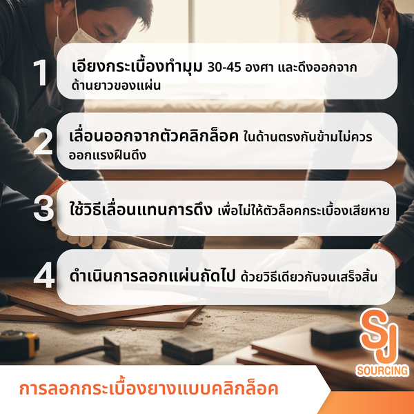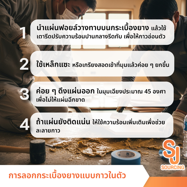 การลอกกระเบื้องยาง มีวิธีแตกต่างกันตามประเภทของกระเบื้อง แบบกาวในตัวใช้ความร้อนช่วย ส่วนแบบคลิกล็อคเอียงทำมุม 30-45 องศาแล้วดึงออก